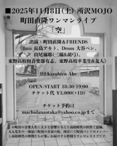 ※町田の音楽人生に大きな影響を与えた高校時代の担任で恩師、大入先生の一周忌に町田の青春の街、所沢にて町田バンドのメンバーと高校時代の仲間たちが集いお届けする特別なワンマンライブです。